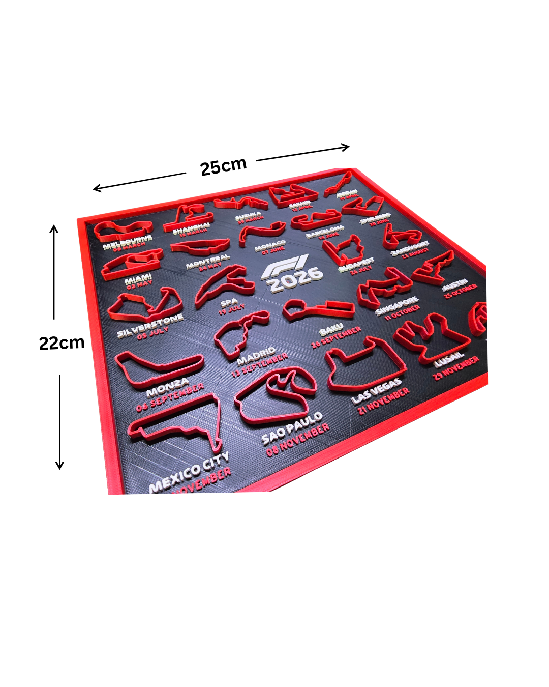 This 3D printed wall art features all 24 official Formula 1 circuits for the 2026 season, rendered in striking blue on a premium black background. Organized chronologically with race names and dates, it combines professional design with detailed track layouts, making it a must-have for F1 enthusiasts and stylish collectors alike.